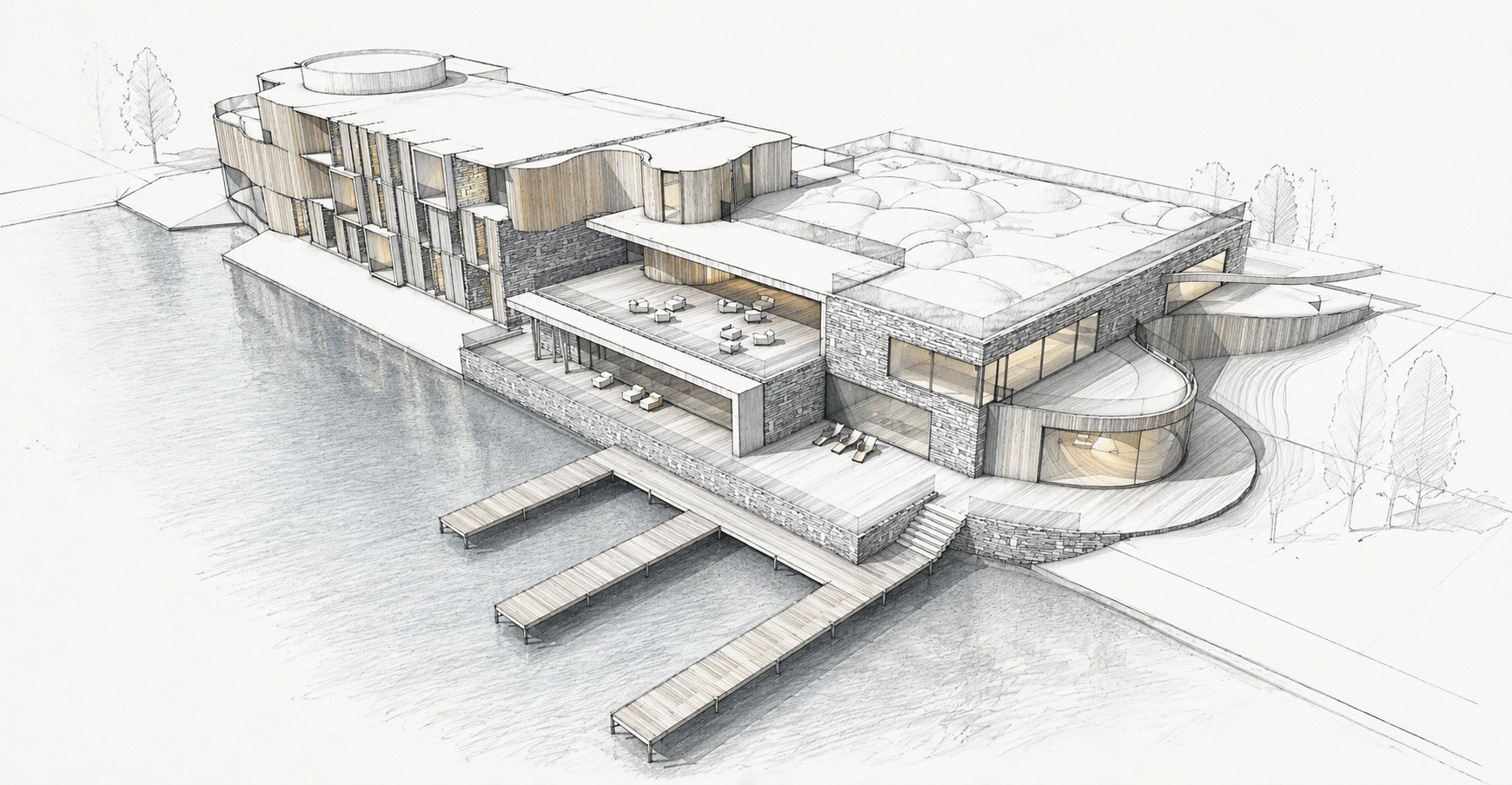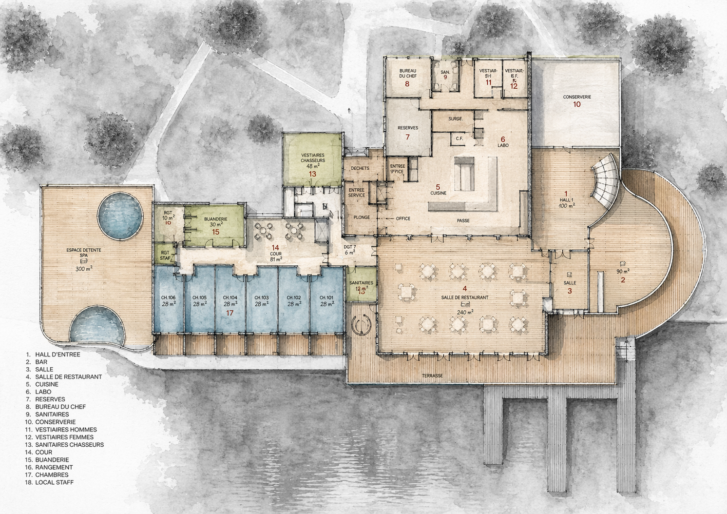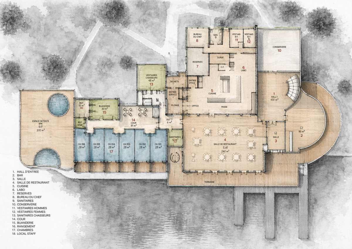 Hôtel de luxe et relais de chasse sur les bords du l’étang de Saint Launeuc, le projet se veut avant-gardiste. Chauffé par une chaufferie bois, le projet comporte 20 chambres (dont deux suites), un espace restauration et des grands espaces communs (bar, salons, Spa,…). Il accueille également un espace pour les séminaires.