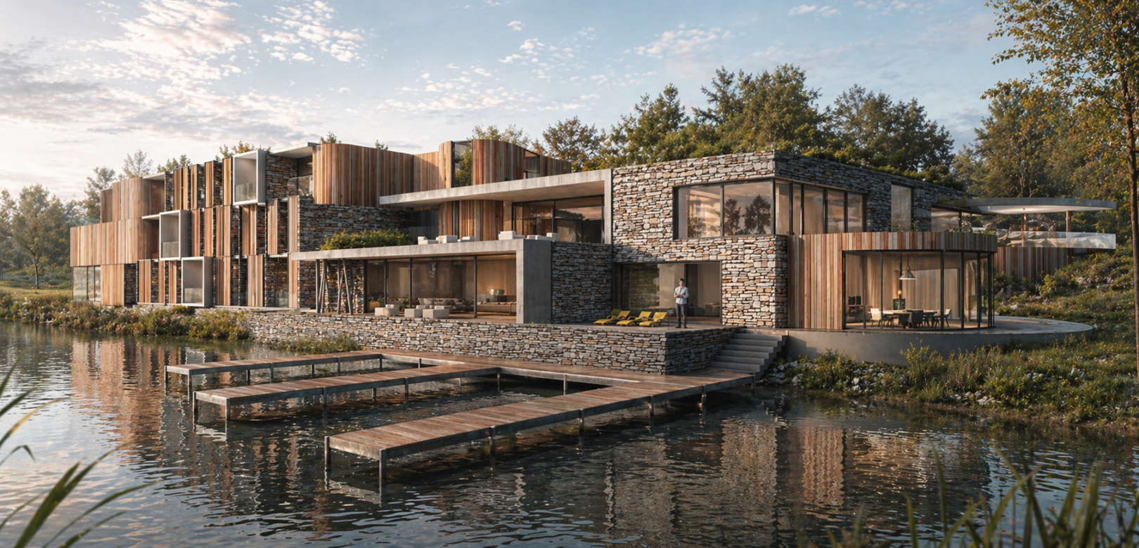 D’inspiration minérale, l’architecture se compose autour de l’emploi de matériaux naturels comme le bois et la pierre. Sur 3 niveaux successifs, les espaces crées sont autant de belvédères offrant une vue sur le l’étang, alimenté par la Rance.
